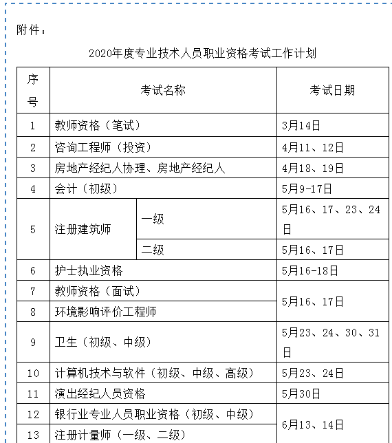 一、请按照《2020年度专业技术人员职业资格考试工作计划》(见附件)做好考试组织实施工作,确保各项考试安全顺利进行。如遇特殊情况需要变更考试日期的,将提前另行通知。