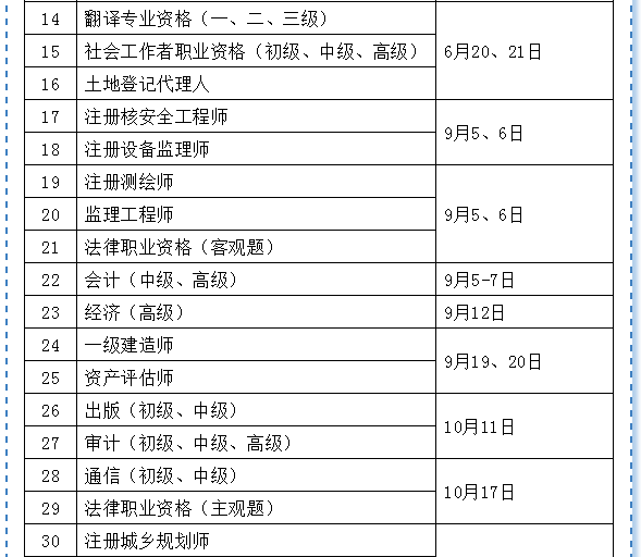 三、教师资格下半年考试,执业兽医资格,文物保护工程从业资格,认证人员职业资格,特种设备检验、检测人员资格等具体考试日期由相关部门另行通知。证券期货业从业人员资格(含基金从业人员资格)各次考试地点不同,具体安排以相关行业协会考试公告为准。专业技术人员计算机应用能力考试日期由各地自行确定。