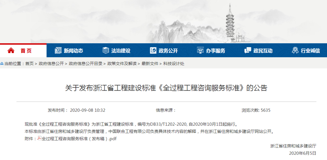 现批准《全过程工程咨询服务标准》为浙江省工程建设标准,编号为DB33/T1202-2020, 自2020年10月1日起施行。