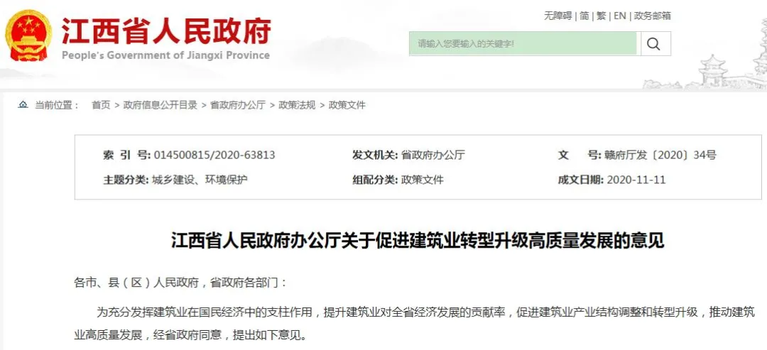 11月11日,江西省人民政府办公厅印发《关于促进建筑业转型升级高质量发展的意见》,提出要加快转变工程建设组织实施方式,大力推行绿色建造、装配式建造,加大智能建造在工程建设各环节应用,推动智能建造与建筑工业化协同发展,打造具有国际竞争力的“江西建造”品牌。
