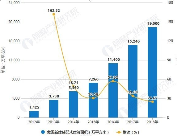 据前瞻产业研究院发布的《中国装配式建筑行业市场前瞻与投资规划深度分析报告》统计数据显示,正是由于这三个驱动因素的加持,2012年中国新建装配式建筑面积仅仅达1425万平方米,之后呈现出爆发式增长态势,到了2016年中国新建装配式建筑面积突破1亿平方米,截止至。2018年我国建筑工业化程度进一步提高,装配式建筑发展良好,全年新建装配式建筑面积约1.9亿平方米,同比增长24.67%。