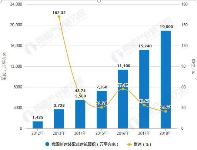 据前瞻产业研究院发布的《中国装配式建筑行业市场前瞻与投资规划深度分析报告》统计数据显示,2012年中国新建装配式建筑面积仅仅达1425万平方米,之后呈现出爆发式增长态势,到了2016年中国新建装配式建筑面积突破1亿平方米,截止至。2018年我国建筑工业化程度进一步提高,装配式建筑发展良好,全年新建装配式建筑面积约1.9亿平方米,同比增长24.67%。