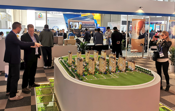 第23届国际被动房大会上,几名国外专家参观“被动房在河北”展厅中的列车新城沙盘