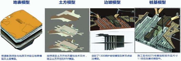 本工程创建了地表模型、土方模型、边坡模型和桩基模型,进行地质条件的模拟和分析,土方开挖工差算量,节点做法可视化交底以及对8275根桩基的精细化管理。
