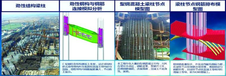 本工程劲性钢结构具有体量大、分布广、种类多、结构复杂等几方面特点,用钢量达1万余t,与混凝土结构大直径钢筋连接错综复杂。在正式施工前,深化设计人员利用BIM技术,将所有劲性钢结构和钢筋进行放样模拟,在钢结构加工阶段完成钢骨开孔和钢筋连接器焊接工作;并与结构设计师密切沟通,形成完善的深化设计方案指导现场施工。