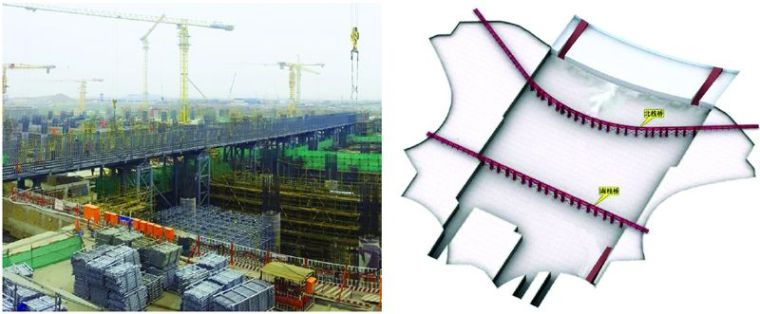 本工程首次将钢栈道应用在超大平面的建筑工程中,以解决深槽区中间部位塔吊吊次不足的问题。