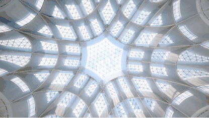 遗传算法是人工智能领域的计算机技术,我们将其应用在遮阳网片计算和C形顶的结构划分这两部分工作中,计算机在我们通过程序设定的逻辑与条件下,找到了问题的最优解。这是以往无法凭人力得到的。为了降低航站楼能耗,我们将一层轻薄的遮阳网片置于采光顶玻璃片的中空层中,在保障室内采光的同时可以最大程度遮挡南向直射光。每个遮阳网片单元形式由4个参数控制,每个参数的不同取值会组合产生上万种形式。计算机根据采光顶所处的位置从中筛选出其中热工性能的最优解,使得透过采光顶获得约60%进光量的同时仅接收约40%的热能。