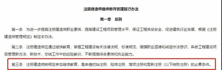 根据国家住建部发布的《注册建造师继续教育管理暂行办法》规定,注册建造师按规定参加继续教育,是申请初始注册、延续注册、增项注册和重新注册(以下统称注册)的必要条件。