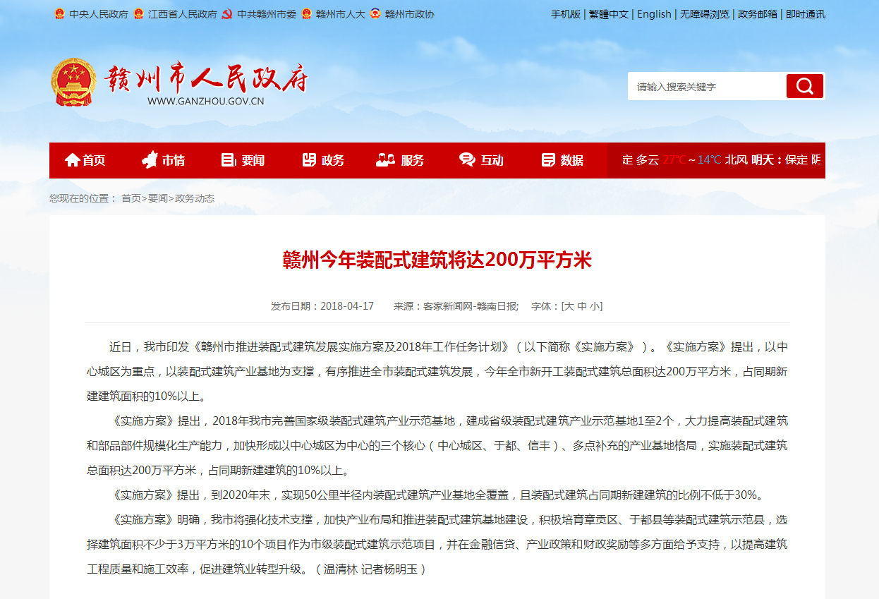 赣州今年装配式建筑将达200万平方米