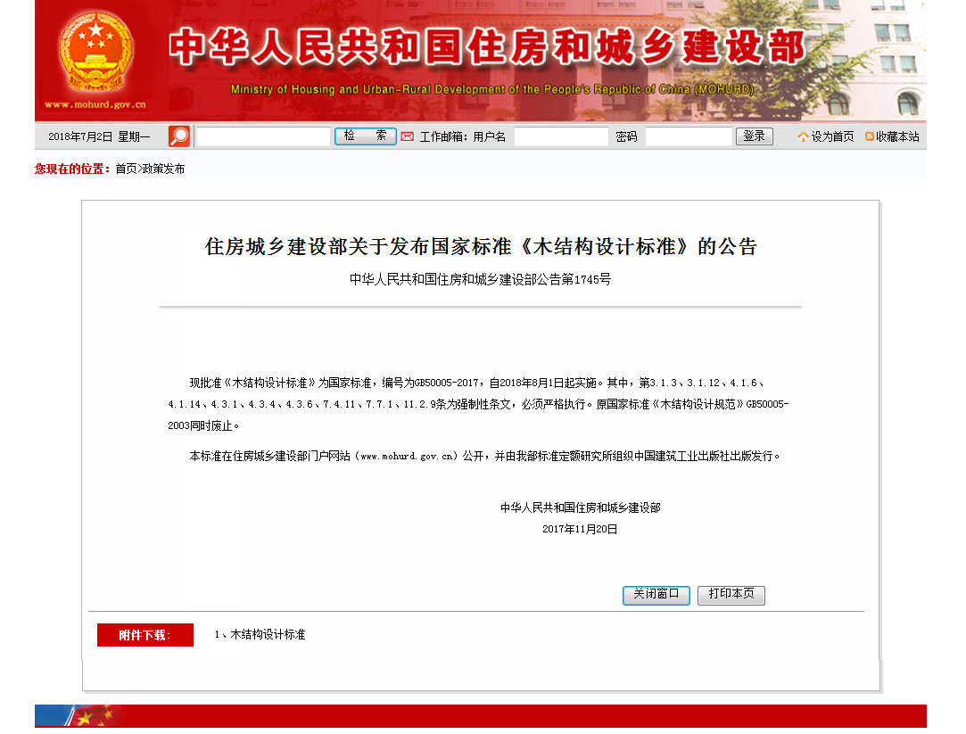住房城乡建设部关于发布国家标准《木结构设计标准》的公告