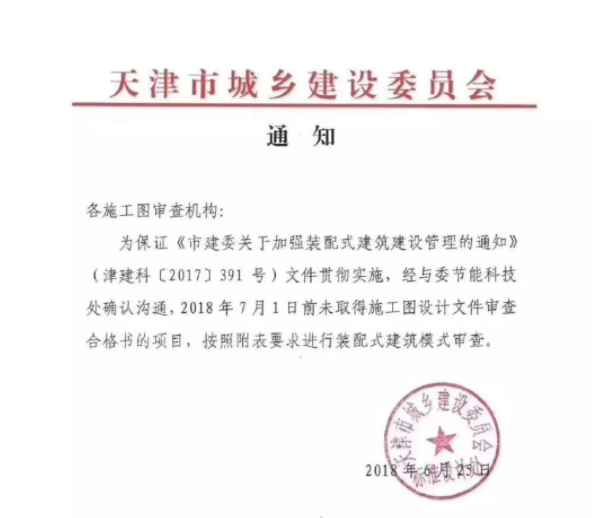 天津城乡建设委员会:7月1日前未图审,按要求实施装配式建筑