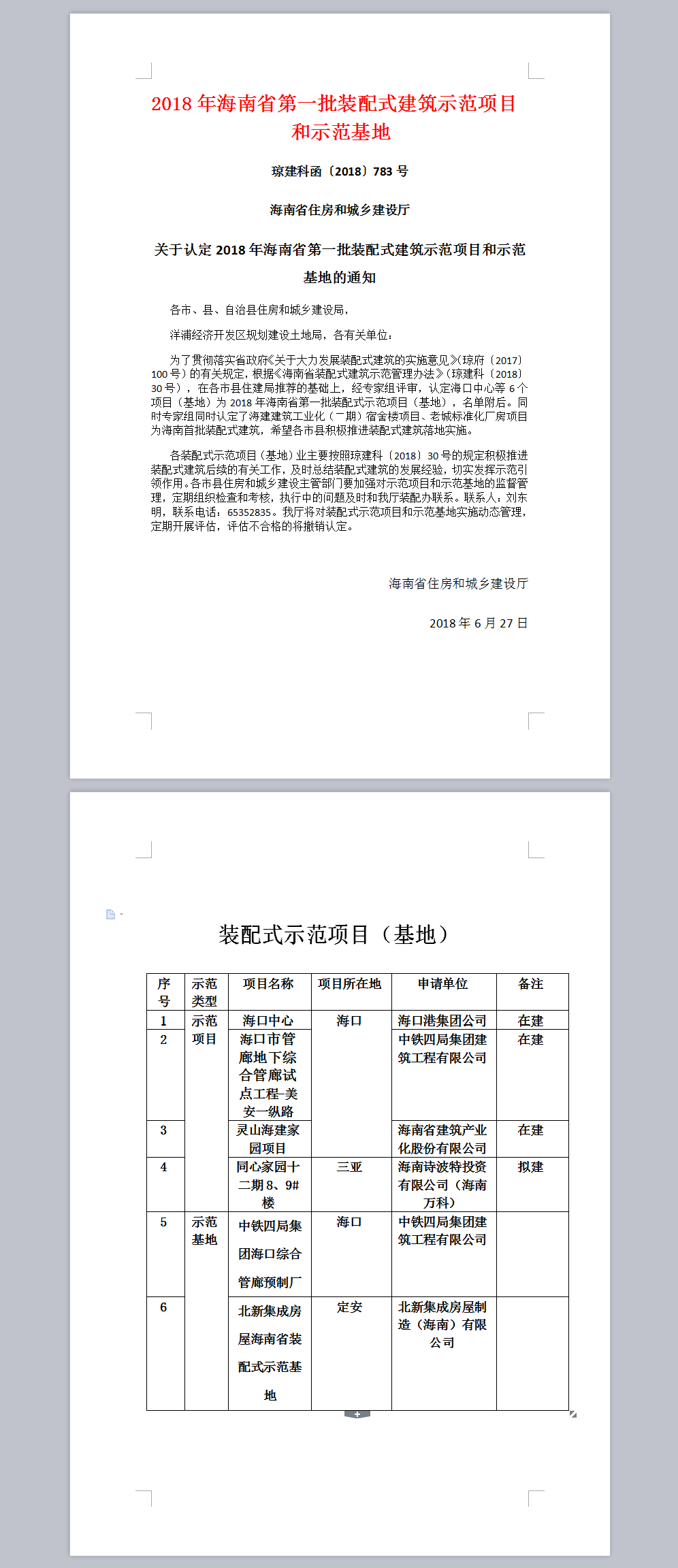 2018年海南省第一批装配式建筑示范项目和示范基地