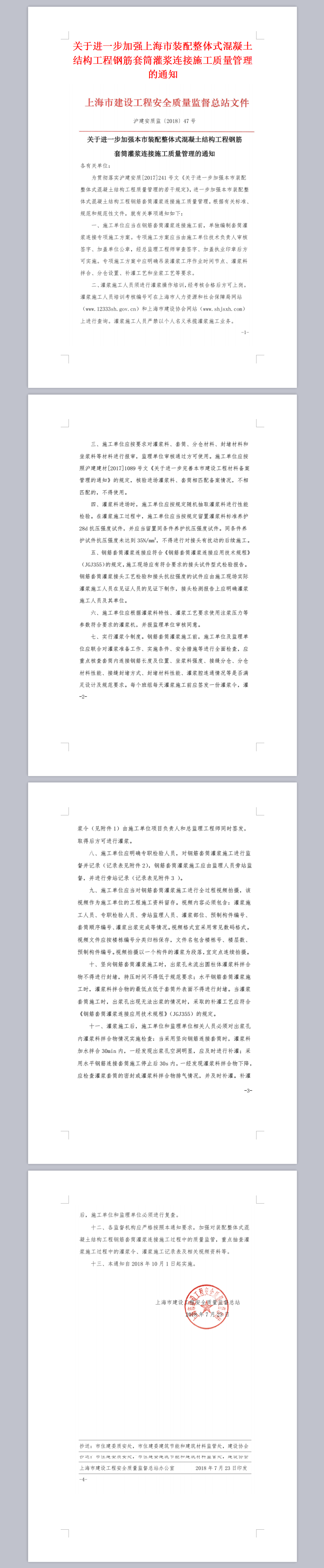 关于进一步加强上海市装配整体式混凝土结构工程钢筋套筒灌浆连接施工质量管理 的通知