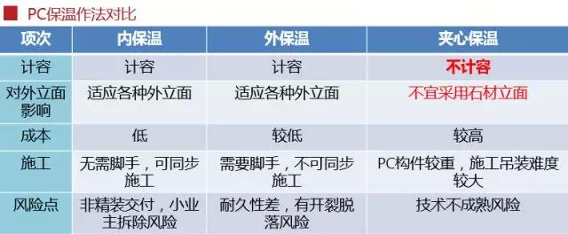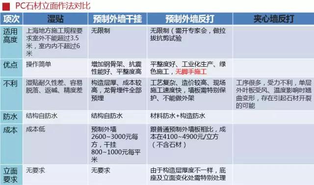 装配式建筑对很多现有的建筑做法都有不同的影响,其中对外墙保温做法和石材立面做法的影响最为明显,下面两张表,清楚对比了各种做法的优缺点、成本和施工因素、适用性等方面。